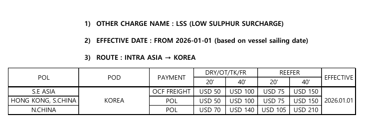 2. We notify the implementation of LSS Charges for Import to Korea with effect from 1st of Jan 2026 (based on v sailing date) as below.