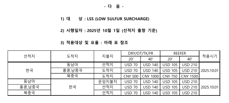 [OTHER CHARGE] 2025년 4분기 수출입 LSS 요율 안내