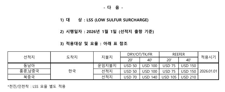 [OTHER CHARGE] 2026년 1분기 한국착 수입 LSS요율 안내